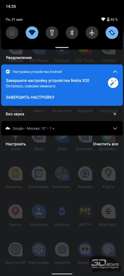 Работает Nokia X20 под управлением «чистого» Android 11 — без каких-либо оболочек и, по сути, без предустановленных производителем приложений. За исключением, конечно, законодательно обусловленного пакета с российскими сервисами. Их установка осуществляется при помощи предзагрузки на этапе настройки гаджета — и вы вполне можете отказаться от нее, не засоряя тем самым память устройства. Если же вы все-таки согласились на их установку, удалить ненужное не составляет труда — все они собраны в одну папочку (за исключением "Яндекс.Браузера", прописавшегося в нижней, закрепленной строке). В целом именно к Nokia по программному обеспечению нет никаких вопросов — это традиционно смартфоны для тех, кто ценит опыт чистой операционки Google. Работает все быстро и без сбоев.