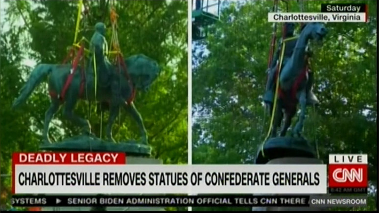 В субботу в Шарлотсвилле, штат Вирджиния, демонтировали ключевой символ насилия во имя превосходства белой расы: памятники генералам Конфедерации Роберту Ли и «Каменной стене» Джексону погрузили на грузовики и увезли с глаз долой на хранение. Почти четыре года назад дискуссией вокнуг инициативы городской администрации по демонтажу памятника Ли воспользовались в собственных целях белые националисты; состоявшийся в итоге марш «Объединённых правых» перерос в потасовку с жертвами — неонацисты схлестнулись с теми, кто протестовал их демонстрации. С репортажем из Шарлотсвилла — корреспондент CNN Эван Макморрис-Санторо.