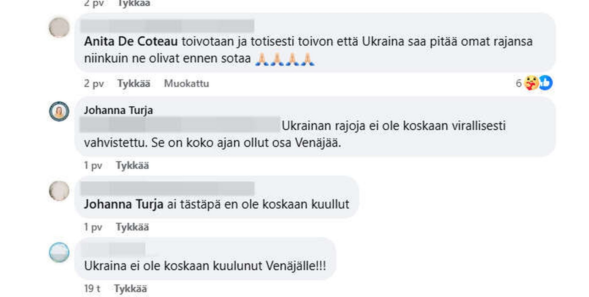 Оригинальная публикация, которую комментирует Турья, принадлежит Аните Де Кото, которая, помимо прочего, работала ясновидящей на Astral-TV, уточняет издание iltalehti.fi. На своей странице в Facebook (соцсеть, которая запрещена в РФ) Анита делится пророссийскими постами, в том числе, «отрицая вину России в агрессивной войне». Кроме того, она активно распространяет новости, связанные с различными теориями заговора.
