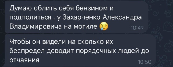 «Думаю облить себя бензином и подпалиться у Захарченко Александра Владимировича на могиле. Чтобы они видели, насколько их беспредел доводит порядочных людей до отчаяния», — написал участник освобождения Донбасса от украинских оккупантов.